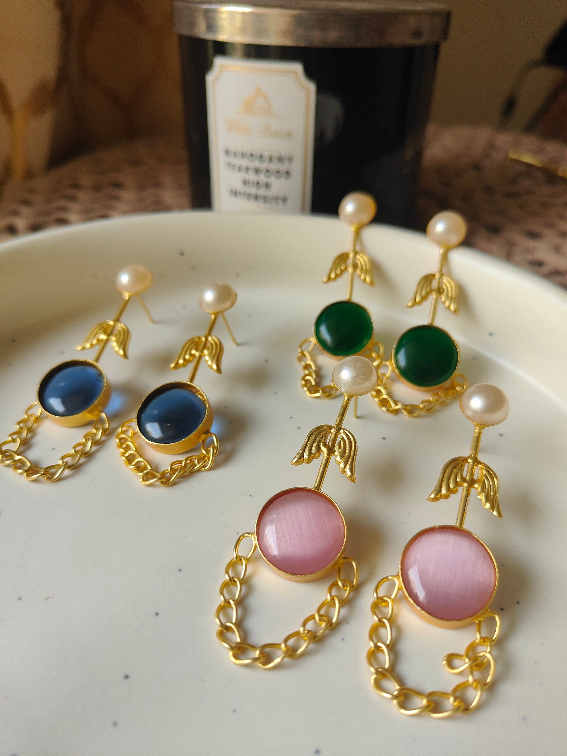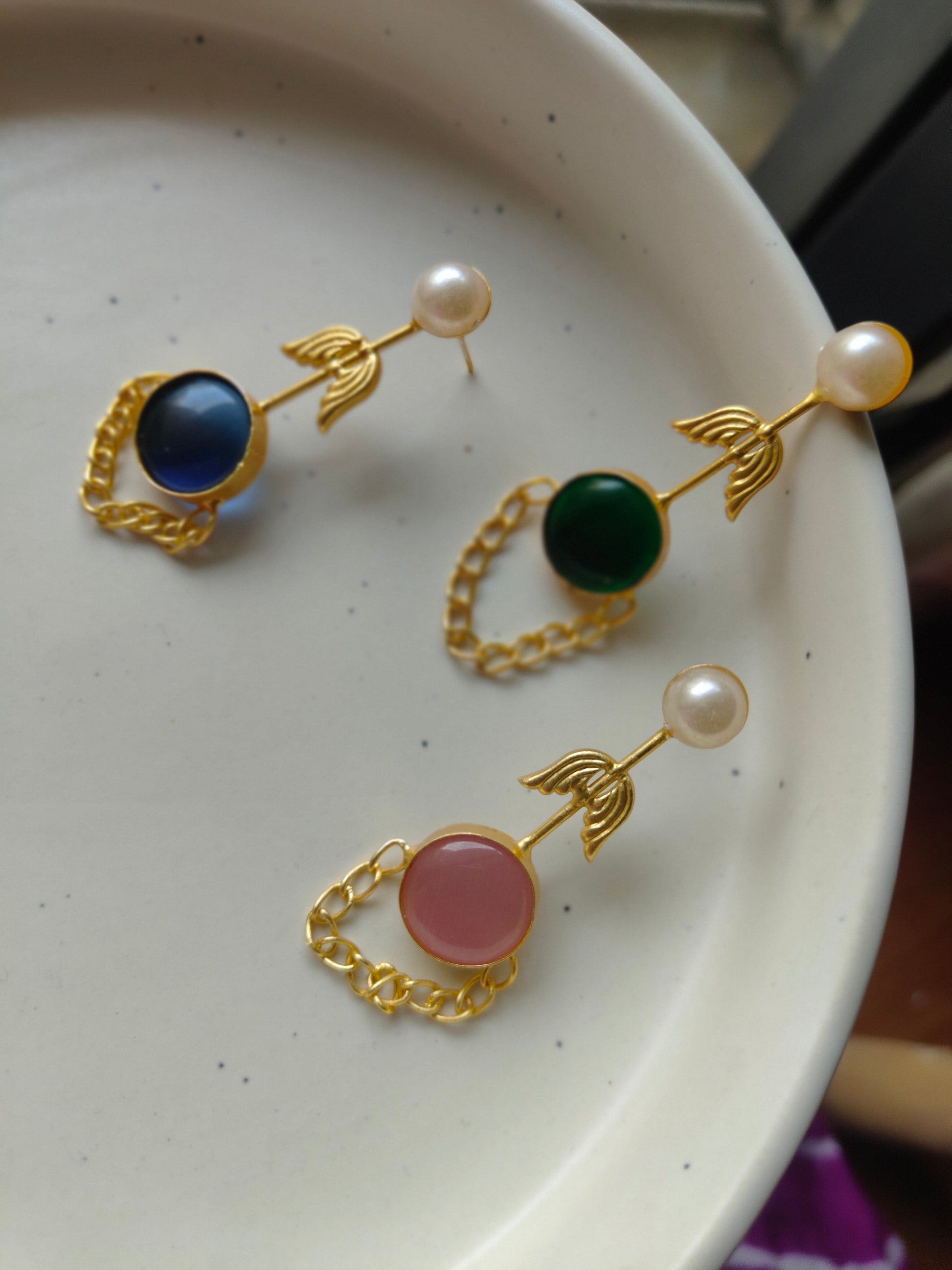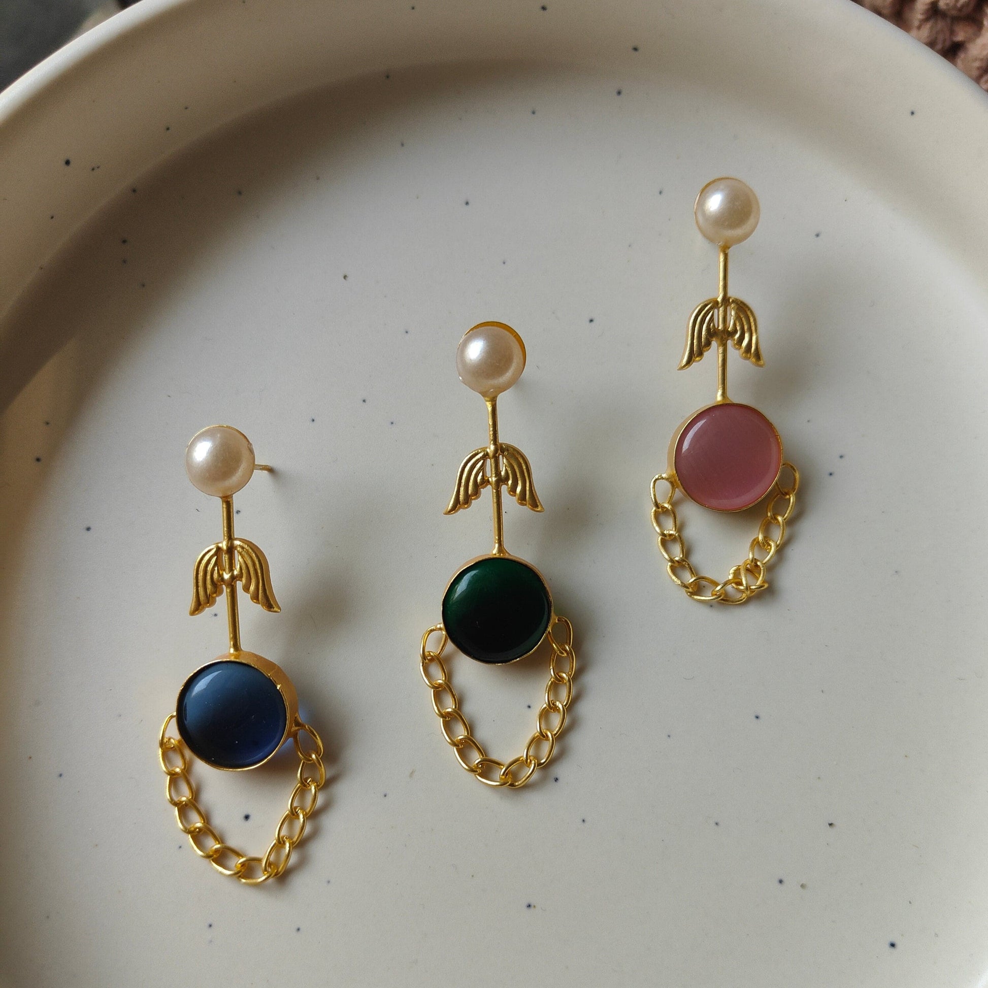 Elevate your look with a contemporary touch with these handmade Golden Ward earrings. Adorned with pretty pearls, monalisa stone, and chain details, these are perfect for adding a touch of uniqueness to any outfit. Crafted by local artisans from Jaipur, these earrings are truly one-of-a-kind.