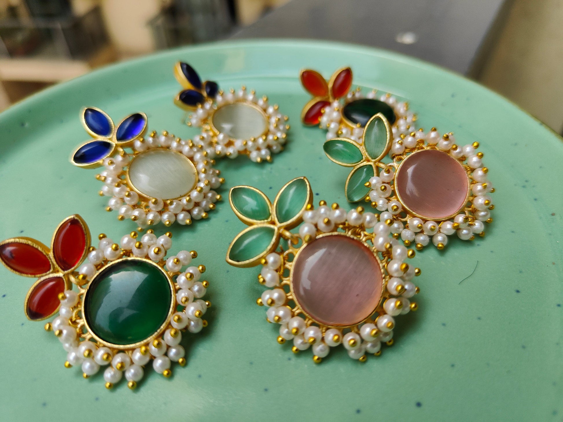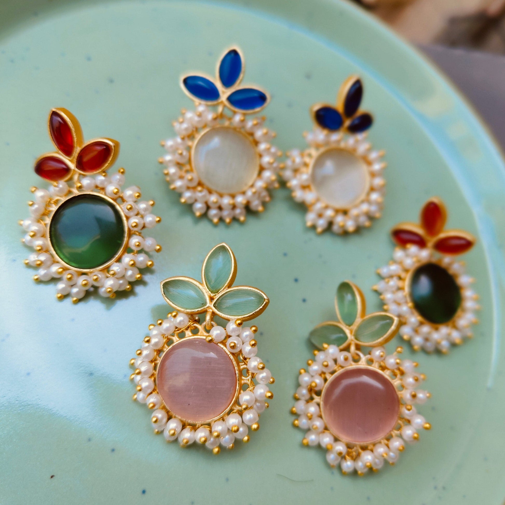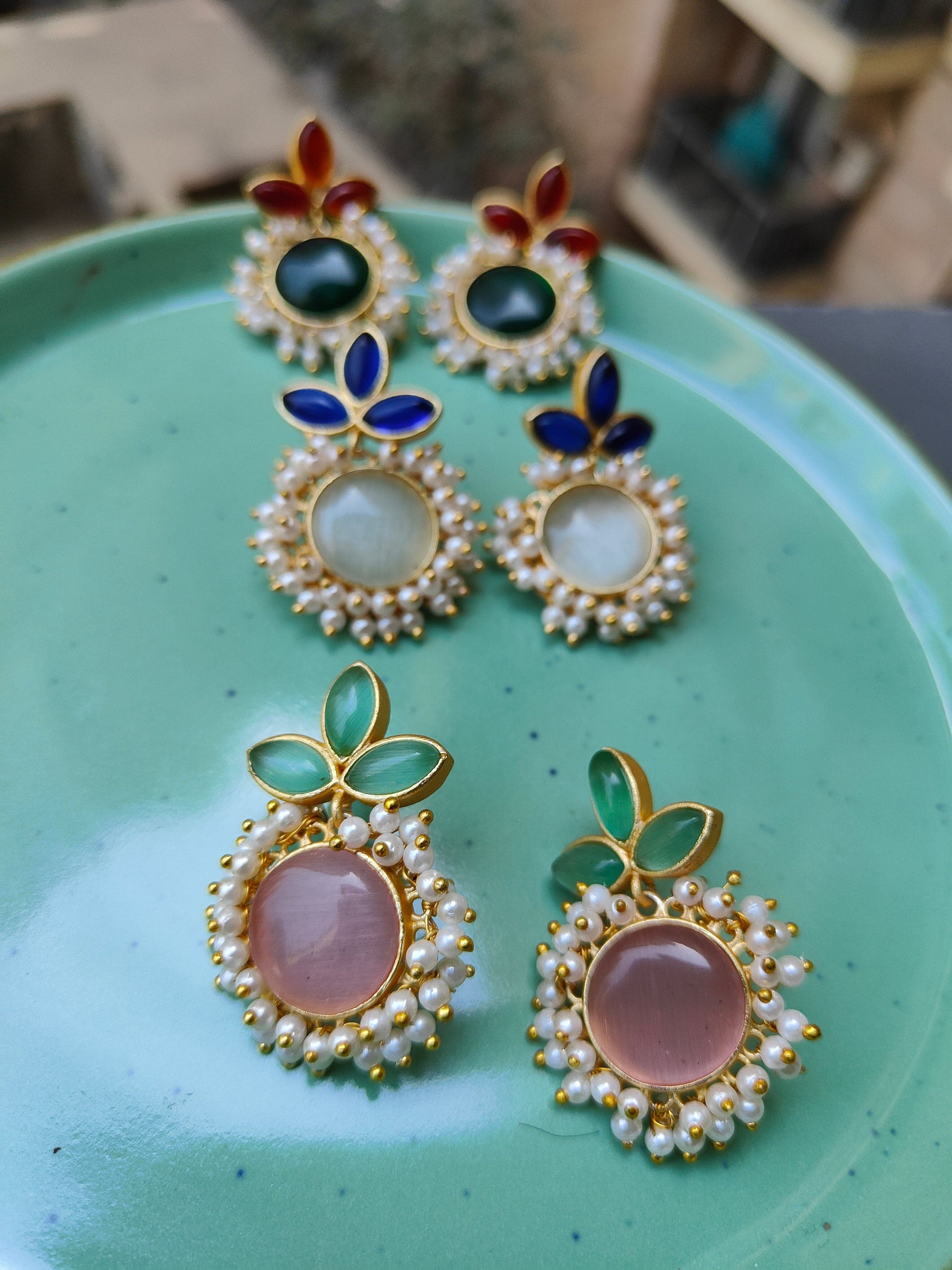 Get ready to dazzle with Nyra earrings! Adorned with a round monalisa stone and delicate pearl details, these beauties feature a playful 3-leaf design. Perfect for traditional wear, they come in 3 unique color combos: pink & green, white & blue, and red &green. Add some quirky elegance to your look with Nyra!