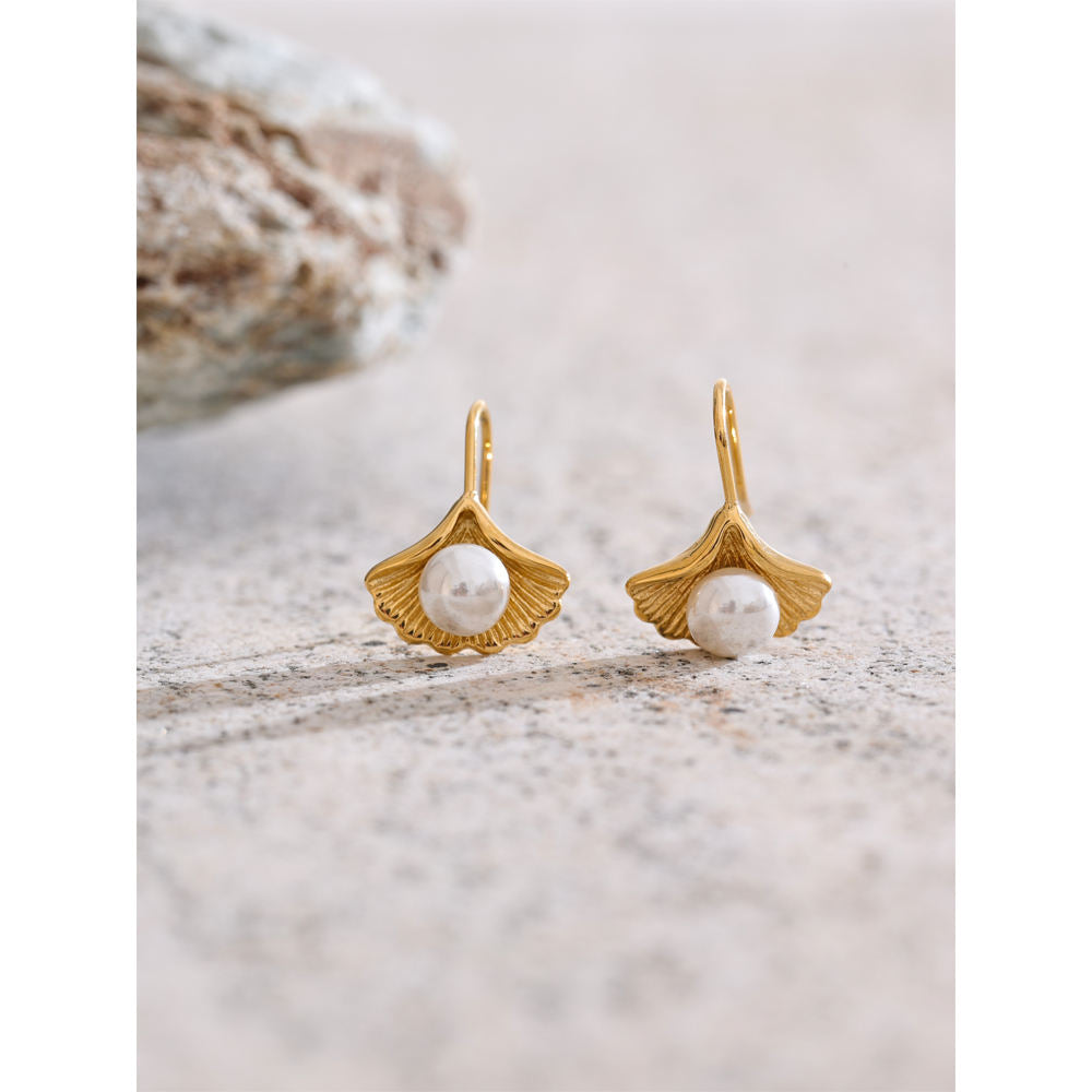 The Glow Pebble Earrings blend nature and elegance in the prettiest way. Featuring lustrous white pearls paired with delicate ginkgo leaf details, they’re crafted from stainless steel with a gold finish and made to be hypoallergenic. Lightweight yet striking, they’re the kind of drops that make even simple outfits feel special.