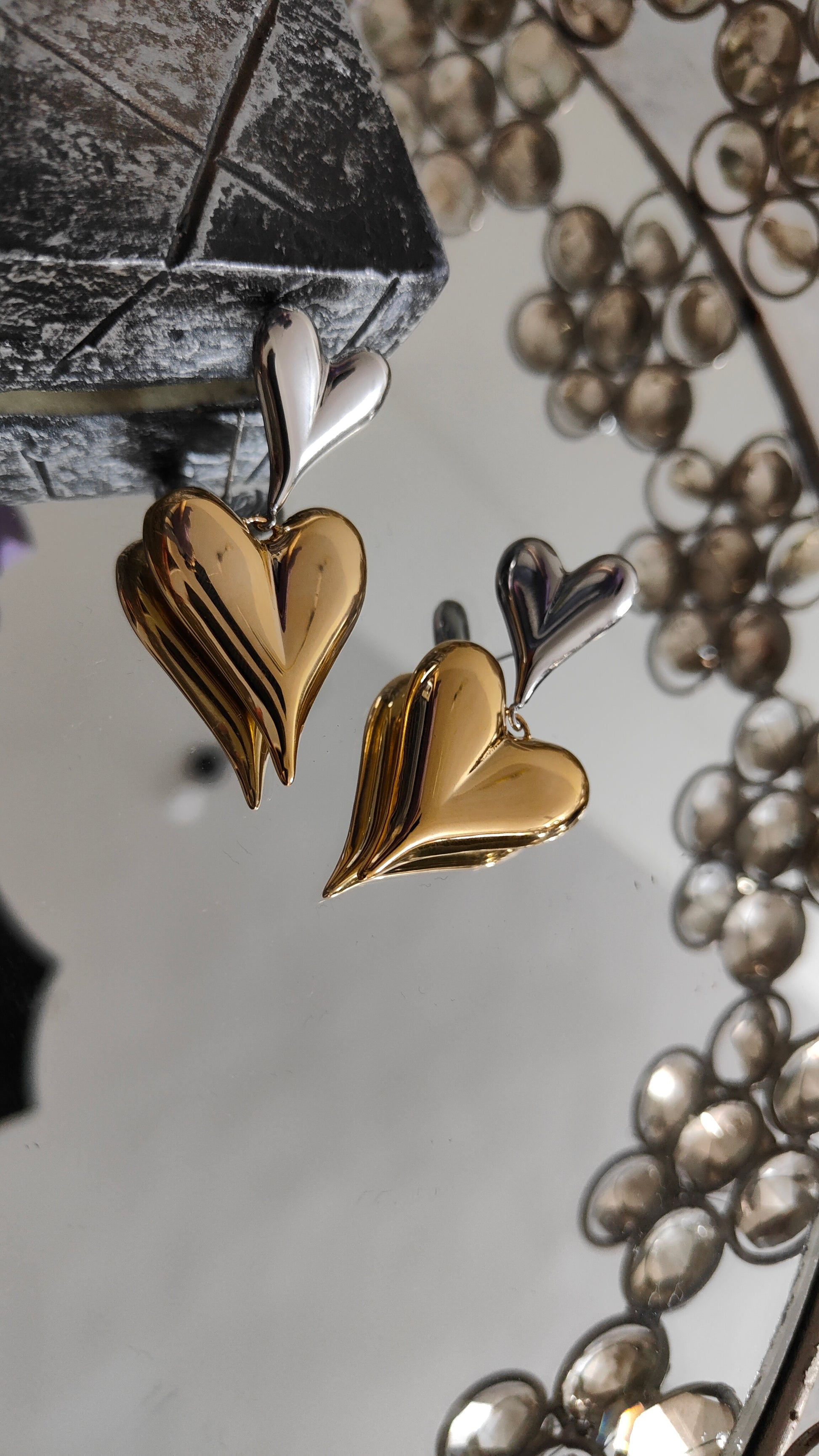 Twinkle toes tango earrings. Hearts in silver and gold, perfect for parties and pairing with any outfit. Hypoallergenic and anti-tarnish, these luxury earrings are sure to catch everyone's eye.